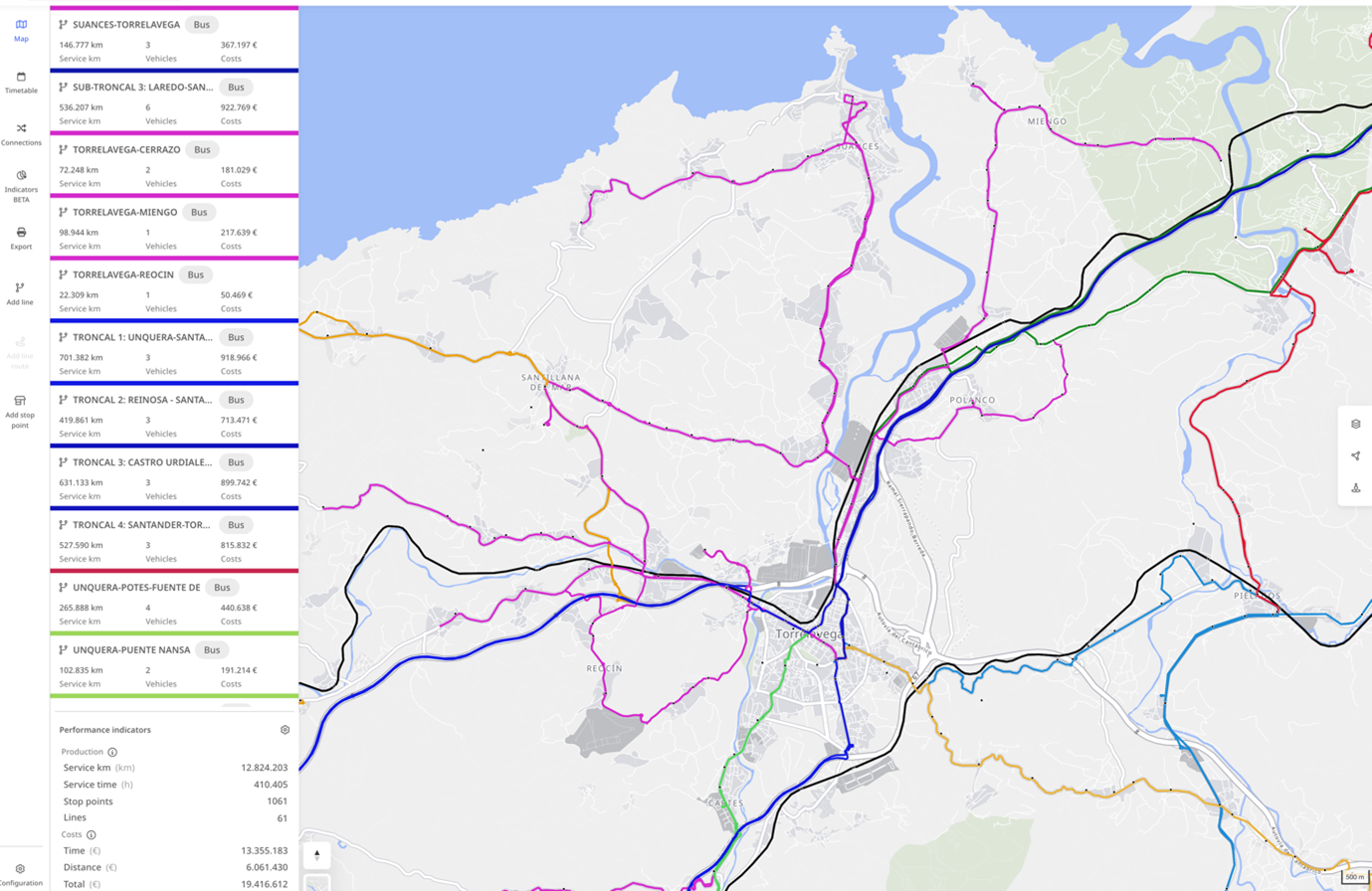 Los investigadores del Sum Lab de la Universidad de Cantabria utilizaron PTV Visum y PTV Lines para rediseñar el anticuado mapa de concesiones de autobuses de la región, creando un sistema de transporte integrado y moderno. El plan introduce 4 líneas troncales de alta frecuencia, 48 líneas regionales y 4 áreas de servicio flexible, mejorando los tiempos de viaje hasta en un 20% alrededor de instalaciones clave y duplicando la oferta de servicios. En conjunto, aumentó la accesibilidad, se optimizaron los costes de operación a 1,82 €/km y se mejoró la eficiencia sin sacrificar la calidad.